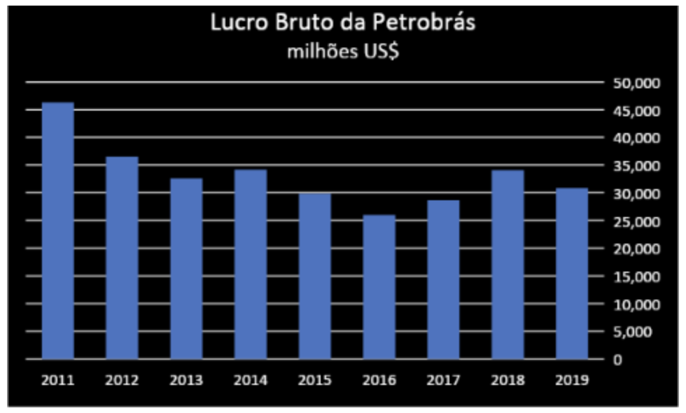 Entre 2011 e 2019, o lucro bruto da Petrobrás se manteve elevado e variou entre US$ 26 bilhões e US$ 46 bilhões.