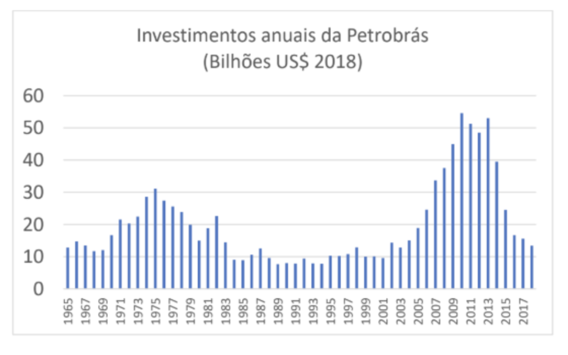 Figura 2: Investimentos Anuais da Petrobrás, entre 1965 e 2018 (em Bilhões US$ atualizados para 2018)