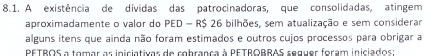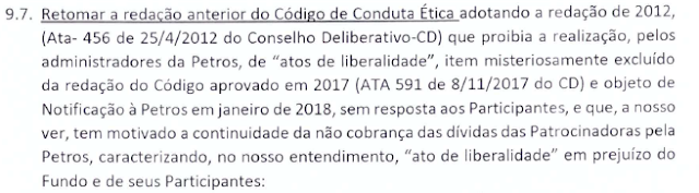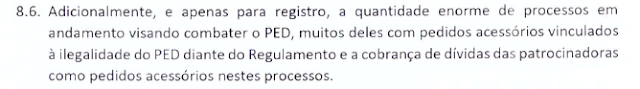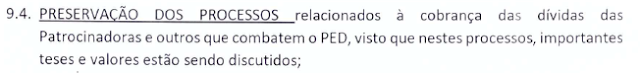 Em relação à cobrança dos aportes extraordinários das patrocinadoras no PED, que deixam de fazer alegando a paridade contributiva, esse debate foi vencido por nós no âmbito da Petros que deverá fazer a cobrança administrativa e judicial desses valores.