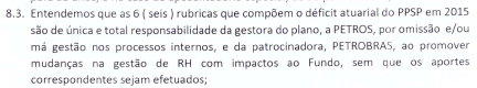 - Retirada do teto operacional dos 90% (R$ 3,4 bi): também não é de responsabilidade exclusiva das patrocinadoras, cuja decisão em dezembro de 2015 no Conselho Deliberativo (CD) criou um novo déficit técnico da ordem de R$ 3,5 bilhões. Essa inconsistência na concessão dos benefícios vinha sendo apontada por nós desde 2004, com milhares de ações que foram ajuizadas pelos participantes nos tribunais, sobre as quais não se tomou nenhuma providência concreta de verificar o motivo da insatisfação dos assistidos do PPSP. A inércia da Petros em resolver o problema fez o déficit ser incorporado da mesma maneira, ao final do exercício de 2015, de uma só vez, agravando a situação do PPSP, como sabemos. Entretanto, como a responsabilidade da gestão do PPSP é da Petrobrás, como veremos mais adiante, consideramos ser possível imputar essa responsabilidade à patrocinadora.