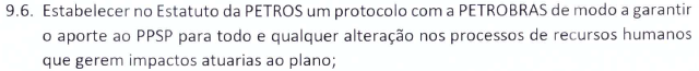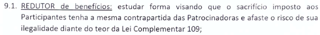ITEM 9.5.2 – Essa questão esbarra na existência do teto de benefícios. Hoje temos no PPSP-NR somente 1.425 participantes ativos e cerca de 97% deles estão topados no teto de contribuições. No PPSP-R são 9.701 participantes ativos, com mais ou menos 97% desses também topados. Ou seja, a medida não irá provocar nenhum efeito real nos planos pela maturidade dos mesmos.