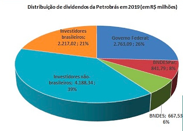 Essa afirmação fica explícita com a distribuição de dividendos entre os acionistas de forma geral. O Estado brasileiro hoje fica com apenas 34% de todo o lucro gerado pela empresa, enquanto os investidores externos são os principais beneficiários do lucro da companhia.