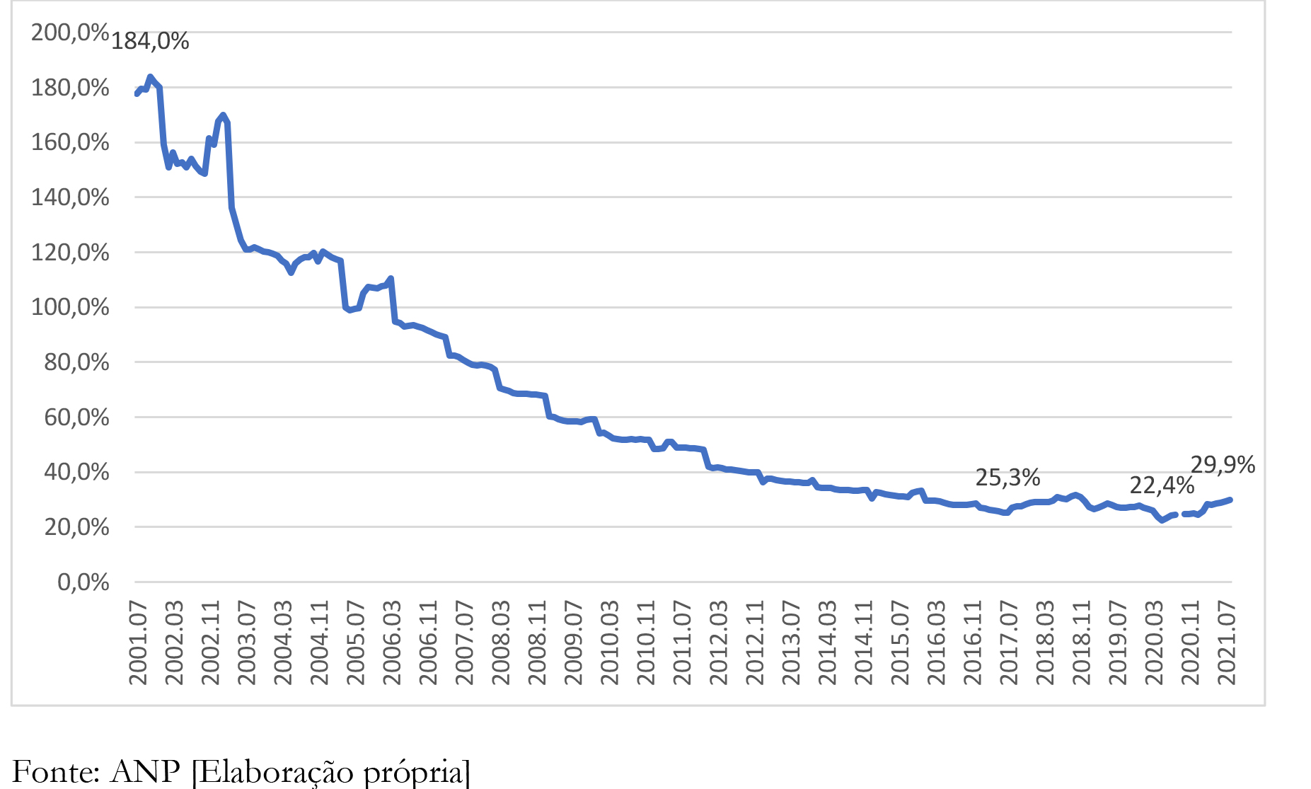 Gráfico 2 – Proporção do preço de um tanque de 55 litro de gasolina comum em relação ao total de um salário-mínimo (julho de 2001 a agosto de 2021)