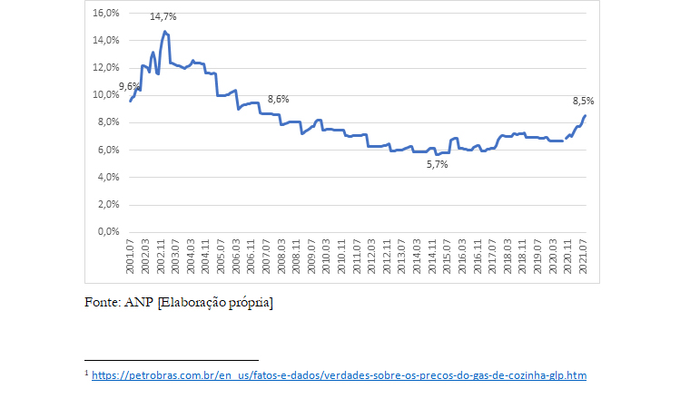 Gráfico 1 – Proporção do preço de um botijão de gás de 13kg em relação ao total de um salário-mínimo (julho de 2001 a agosto de 2021)