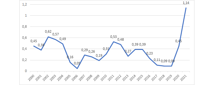A pesquisa mostrou que, mais uma vez, batemos recorde de inflação: "trata-se do maior resultado para o mês de setembro desde o início do Plano Real, em 1994, quando ficou em 1,63%"[1]. Como podemos ver no Gráfico 1, com os dados disponíveis, que temos um patamar muito mais elevado do que todos os resultados para o mês de setembro deste século.