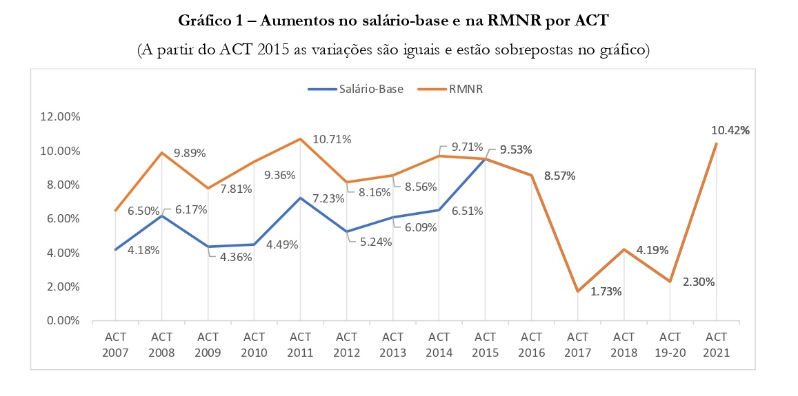Após a implementação da remuneração mínima (RMNR), em julho de 2007. Do pactuado para setembro no ACT 2007 até o final da vigência do ACT 2014 (em agosto de 2015), nesses oito anos, os reajustes da RMNR superaram os ganhos do salário-base (este último era reajustado pelo IPCA), fazendo com que houvesse um ganho real apenas na remuneração global tabelada pela RMNR.