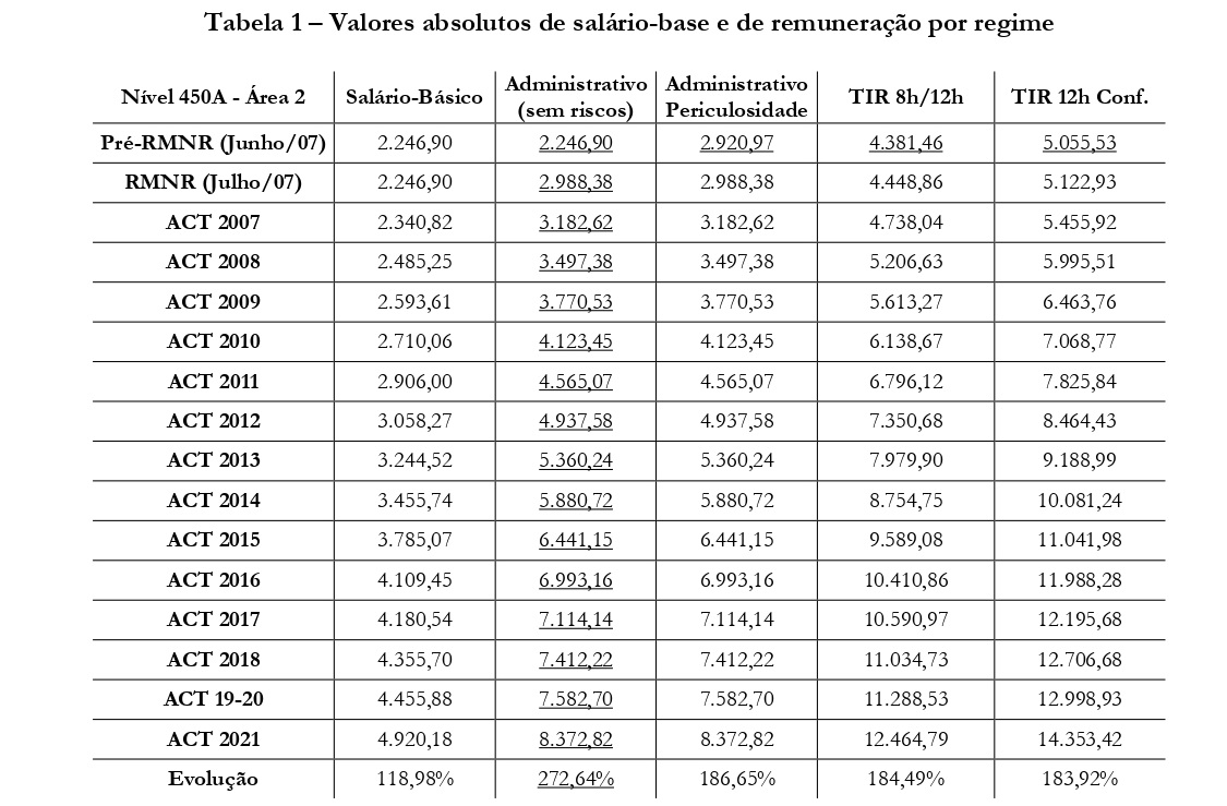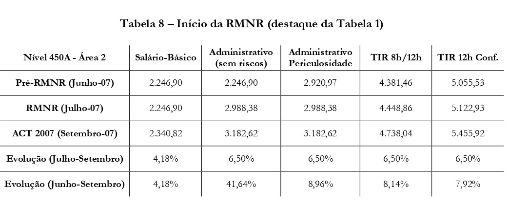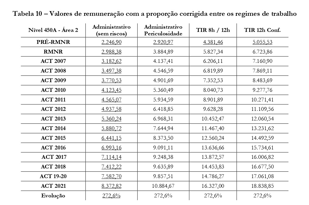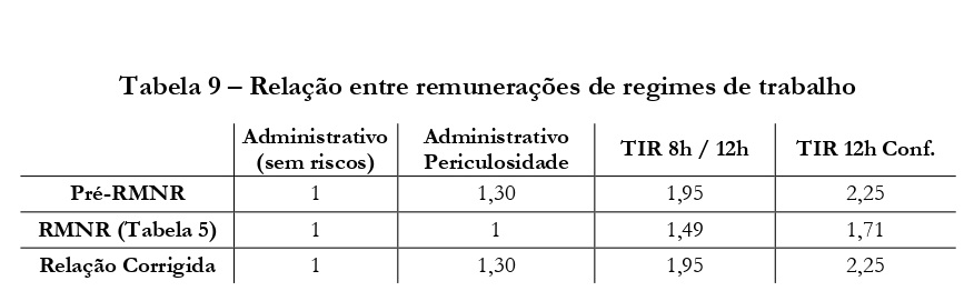 Ante toda discussão apresentada, reconhecer na Tabela 10 de remunerações normalizada pelas relações entre regimes antes das distorções e que diferencia os riscos de cada condição de trabalho, se apresenta como uma fiel caracterização da defasagem salarial advinda da implementação da RMNR.