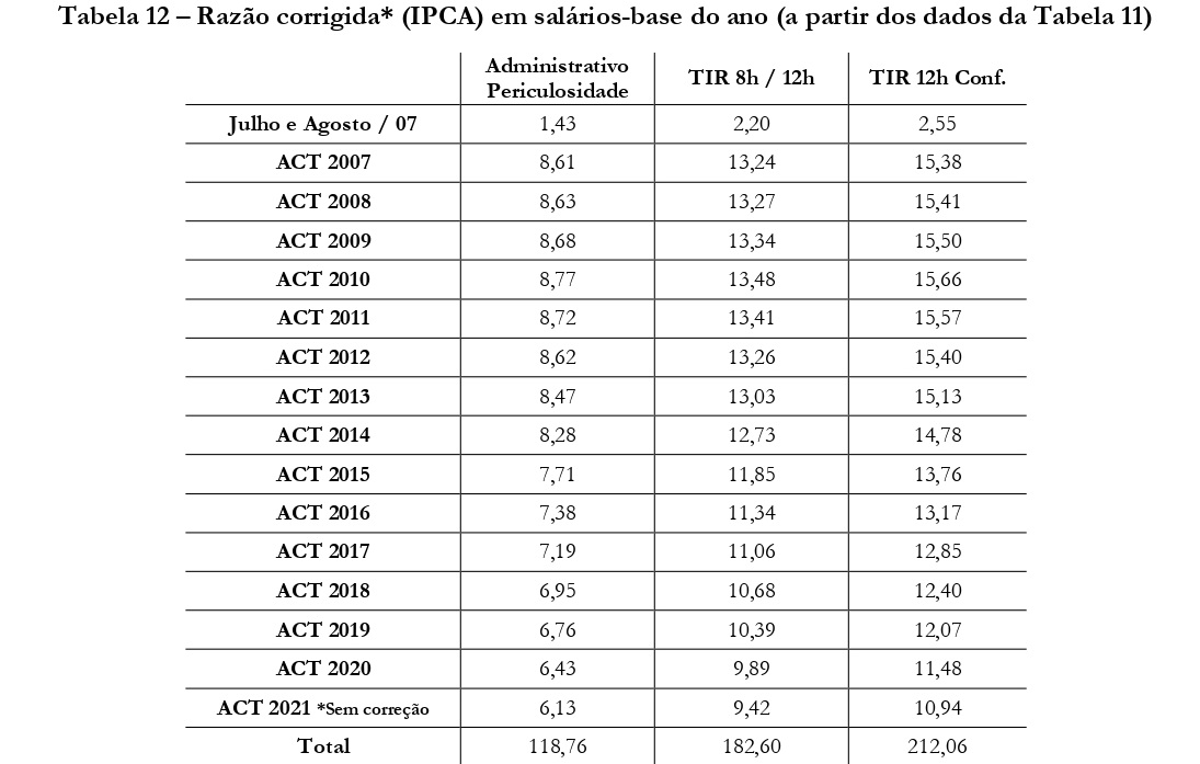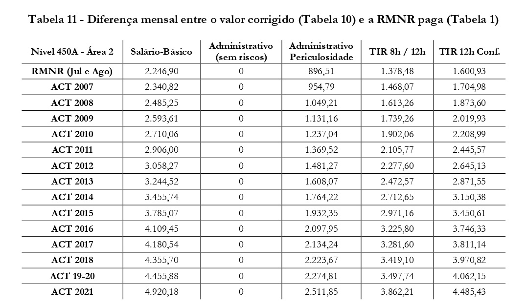 Desde o ACT 2014 as diferenças estabilizaram; assim, os regimes em risco acumulam perdas de, respectivamente; 6,13; 9,42 e 10,94 salários-base por ano. Desde a criação da RMNR, essas perdas somam para o administrativo periculoso, ~119 SB's; para TIR 8h/12h, ~183 SB's; e TIR 12h com confinamento, ~212 SB's. Isso, sem considerar as perdas sobre férias, 13º salário, horas-extras, aumento de nível e o ATS.