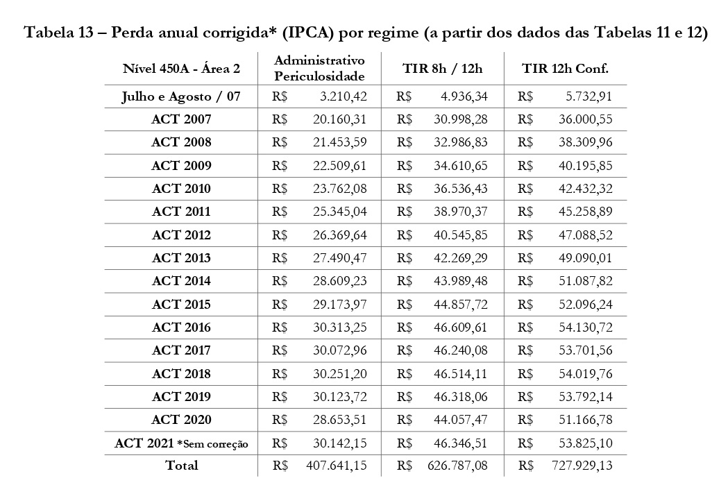 Considerando o nosso exemplo “Nível 450A-2”; em valores corrigidos* até o final do ACT 2021, as perdas somarão R$ 407.641,15 no caso de trabalho administrativo periculoso; R$ 626.787,08 para o TIR8h/12h e R$ 727.929,13 no TIR 12h Confinamento. E este é um valor mínimo, pois não consideramos qualquer verba extra, DSR, aumento de nível ou promoção. Veja na Tabela 13, a relação corrigida* de perdas por regime: