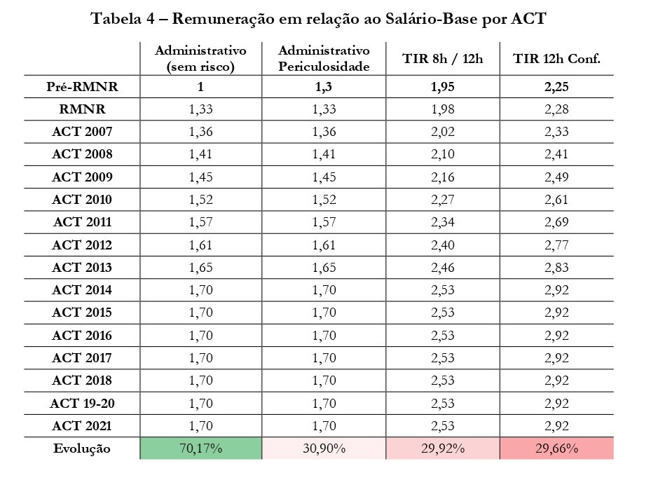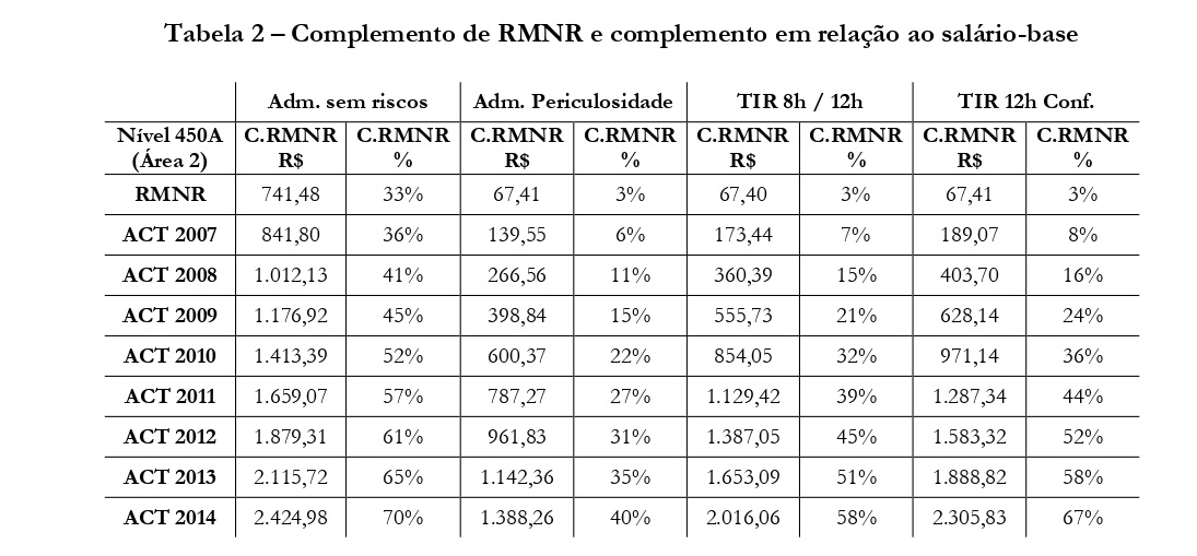 Os aumentos na RMNR acima do salário-base (como pode ser visto no Gráfico 1), do ACT de 2007 até 2014, somaram 26,43% , e fizeram o complemento (de 30% aos que não estavam expostos a riscos laborais e de 3% pela diferença regional), avançar sobre a sua referência, o salário-base. Como pode ser visto na Tabela 2, a proporção do complemento em relação ao salário-base, que iniciaram em 33% para o administrativo e em 3% para o restante, chegou ao nível de 70% para o administrativo, 40% para o administrativo com periculosidade, 58% para o TIR8h /12h e 67% para o TIR12h Conf. Até aqui fica dado a distorção entre a concepção do Complemento da RMNR (C. RMNR) e no que ele se tornou. Mas isto não para por aqui.