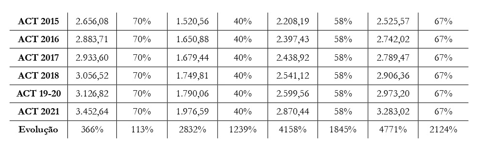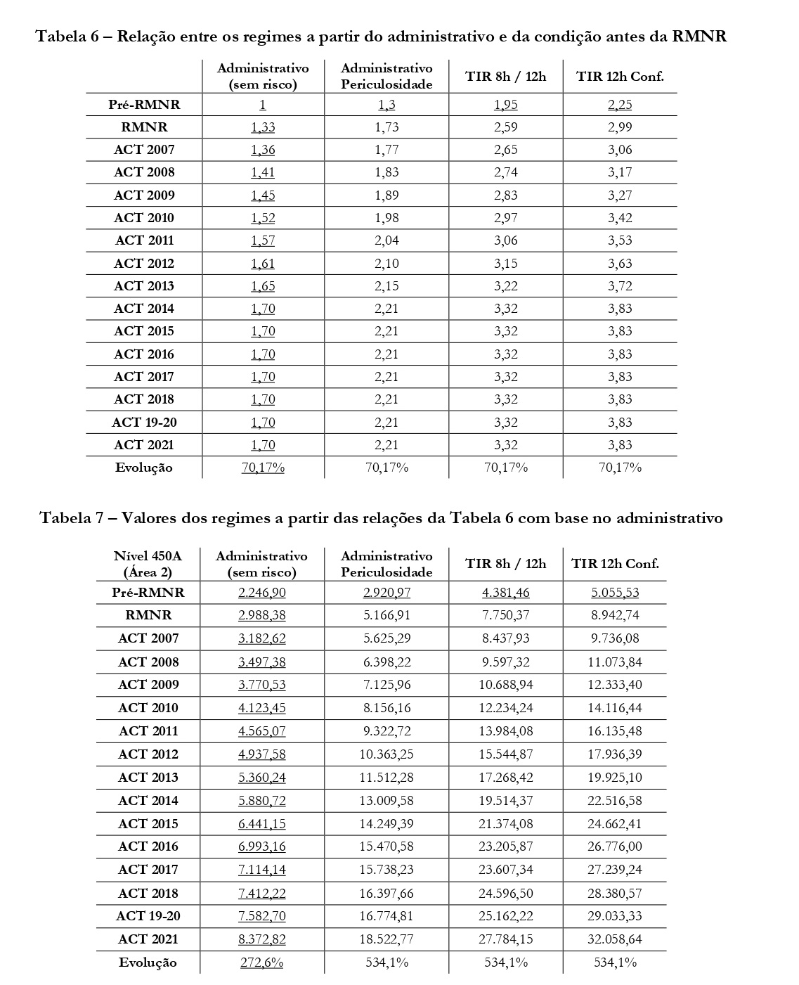 Para ilustrar, vamos normalizar todas as relações entre regimes a partir da evolução ímpar de 70% do regime administrativo (Tabela 4) e mantendo a proporção original antes da RMNR, onde é reconhecida as diferenças legais entre os regimes de trabalho. Ambas as condições base estão sublinhadas nas tabelas a seguir. As relações entre os regimes, sempre mantendo como referência a proporção inicial com o regime administrativo, a partir do ACT 2014 se estabilizaram, respectivamente, em 1,7x, 2,21x, 3,32x e 3,83x.