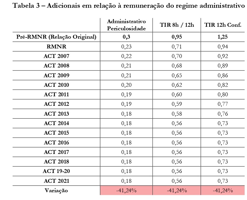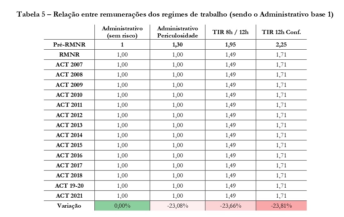 As relações originais entre regimes PRÉ-RMNR eram: de 1,3x onde tinha periculosidade, 1,95x para TIR (8h / 12h) e 2,25x nos Turnos Ininterrupto de Revezamento de 12 horas com confinamento. Para essas relações, o regime administrativo é a referência de todos os regimes adversos que são baseadas em lei, situação que não foi alterada. A mudança foi o implemento da RMNR e os reajustes privilegiando a mesma; que desvalorizando o salário-base e adicionais de adversidade enquanto aumenta a remuneração do administrativo, alterou a relação entre remunerações dos regimes.