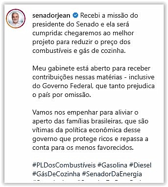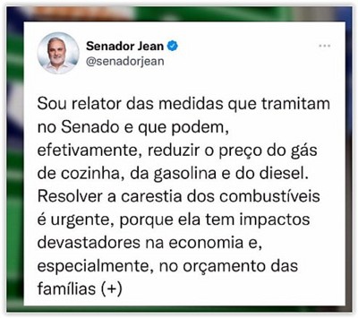 O senador diz com todas as letras que é preciso “garantir o preço internacional para que o refinador e o importador não deixem de investir”.