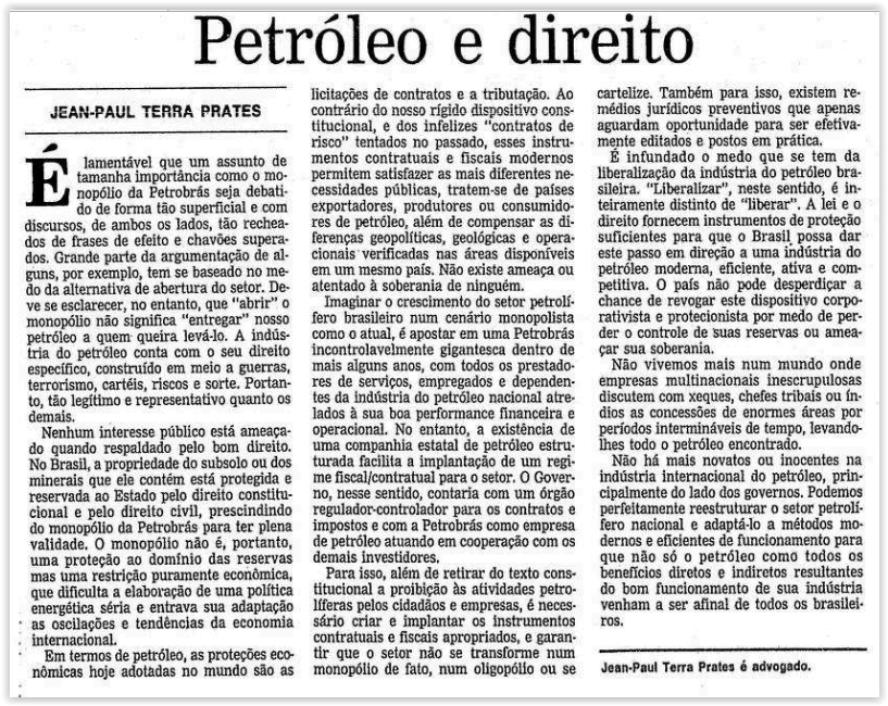 No artigo Petróleo e direito (na íntegra, mais abaixo), publicado em O Globo, em 18 de fevereiro de 1994, ele disse que a quebra do monopólio estatal se “justificaria” pela necessidade de investimentos estrangeiros como um dos passos “em direção a uma indústria do petróleo moderna, eficiente, ativa e competitiva!”
