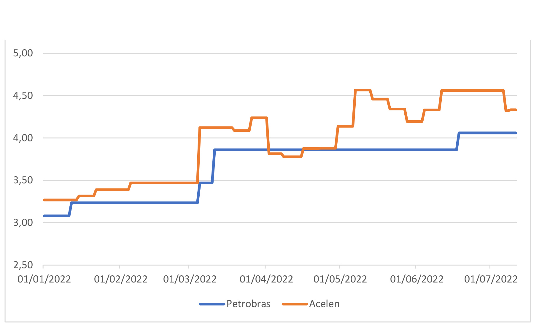 Gráfico 1 – Preços da Gasolina A nas refinarias da Acelen e da Petrobrás (em R$) – de 01/01/2022 a 11/07/2022