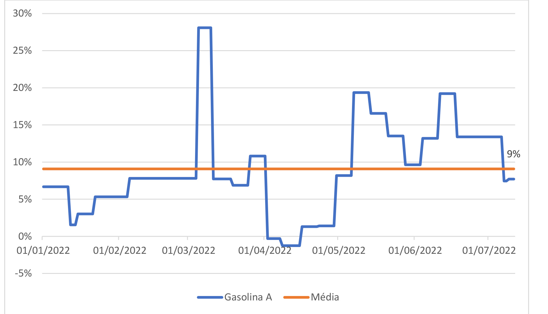 Gráfico 2 – Comparação de preços médios simulados de gasolina que seriam praticados pelas refinarias privatizadas e o preço efetivamente cobrado pelas refinarias sob propriedade da Petrobras – em percentuais (01/01/2022 a 11/07/2022)
