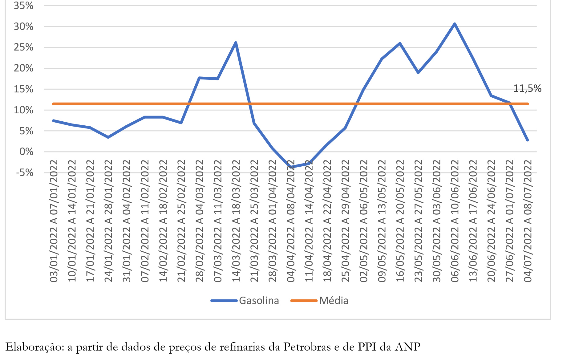 Se estas refinarias cobrassem o preço do PPI, teríamos em média ao longo de 2022 uma gasolina 11,5% mais cara do que efetivamente foi cobrado pela Petrobrás.