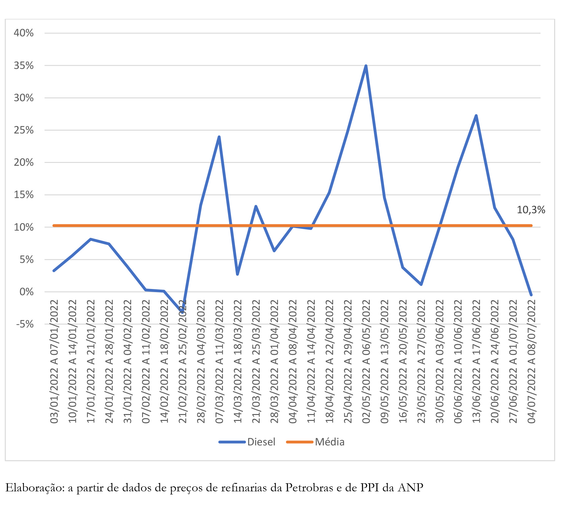Gráfico 3 – Comparação de preços médios simulados de diesel s-10 que seriam praticados pelas refinarias privatizadas e o preço efetivamente cobrado pelas refinarias sob propriedade da Petrobras – em percentuais (01/01/2022 a 11/07/2022)