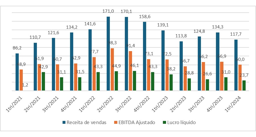 Gráfico 2 – Receita de Vendas, EBITDA Ajustado e Lucro Líquido (em bilhões de R$)