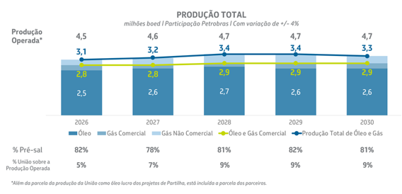 A expectativa de produção total de óleo e gás da companhia cresceu consideravelmente. A projeção para 2026 subiu 7% em relação ao PN anterior, de 3 milhões de boed para 3,2. O pico será em 2029, com 3,4 milhões de boed, 17% superior ao que a companhia produziu nos 9 primeiros meses de 2025. Isto gerará mais caixa para a Petrobras, compensando parcialmente a queda dos preços do petróleo – efeito já foi verificado nos resultados de 2025.