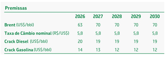 Já as projeções de preço de gasolina e diesel se mantiveram inalteradas para 2029, não projetam mudança de preços de combustíveis no médio prazo, o que preserva o caixa da companhia.