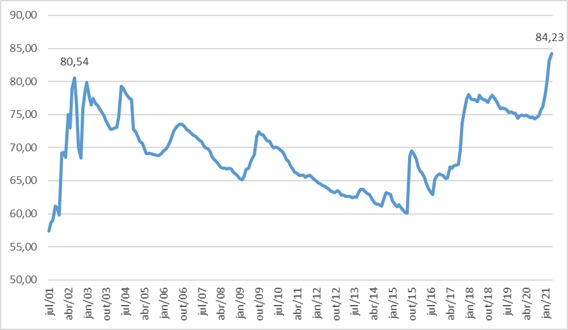 O preço do gás de cozinha chegou ao seu maior nível desde que a ANP disponibiliza este dado, iniciado em julho de 2001. Como pode ser visto no Gráfico 1, deflacionando todos os valores para março deste ano, fica evidente que nunca tivemos um botijão de gás tão caro. A última vez que este valor chegou próximo a este patamar foi há quase duas décadas, em julho de 2002. Atualmente estamos com um preço 21% acima da média deste período, média esta de R$ 69,61 para valores de março de 2021.