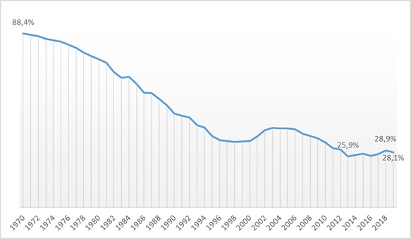 Gráfico 2 – Participação de lenha e carvão na matriz energética residencial do Brasil (1970 – 2019)