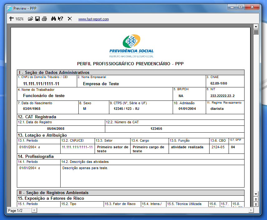 O documento é apresentado em formulário instituído pelo Instituto Nacional do Seguro Social (INSS), contendo informações detalhadas sobre as atividades do trabalhador, exposição a agentes nocivos à saúde e outras informações de caráter administrativo.