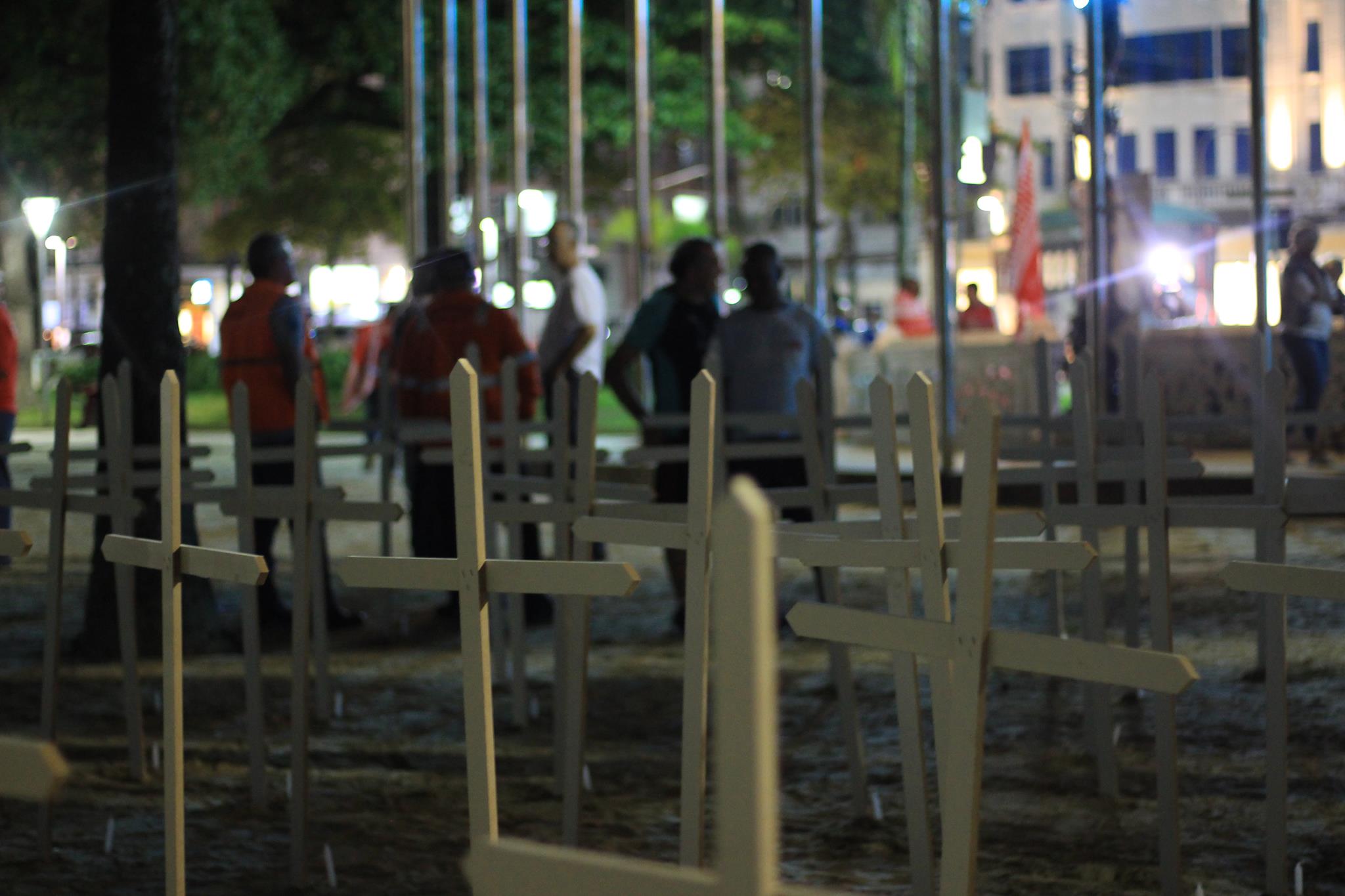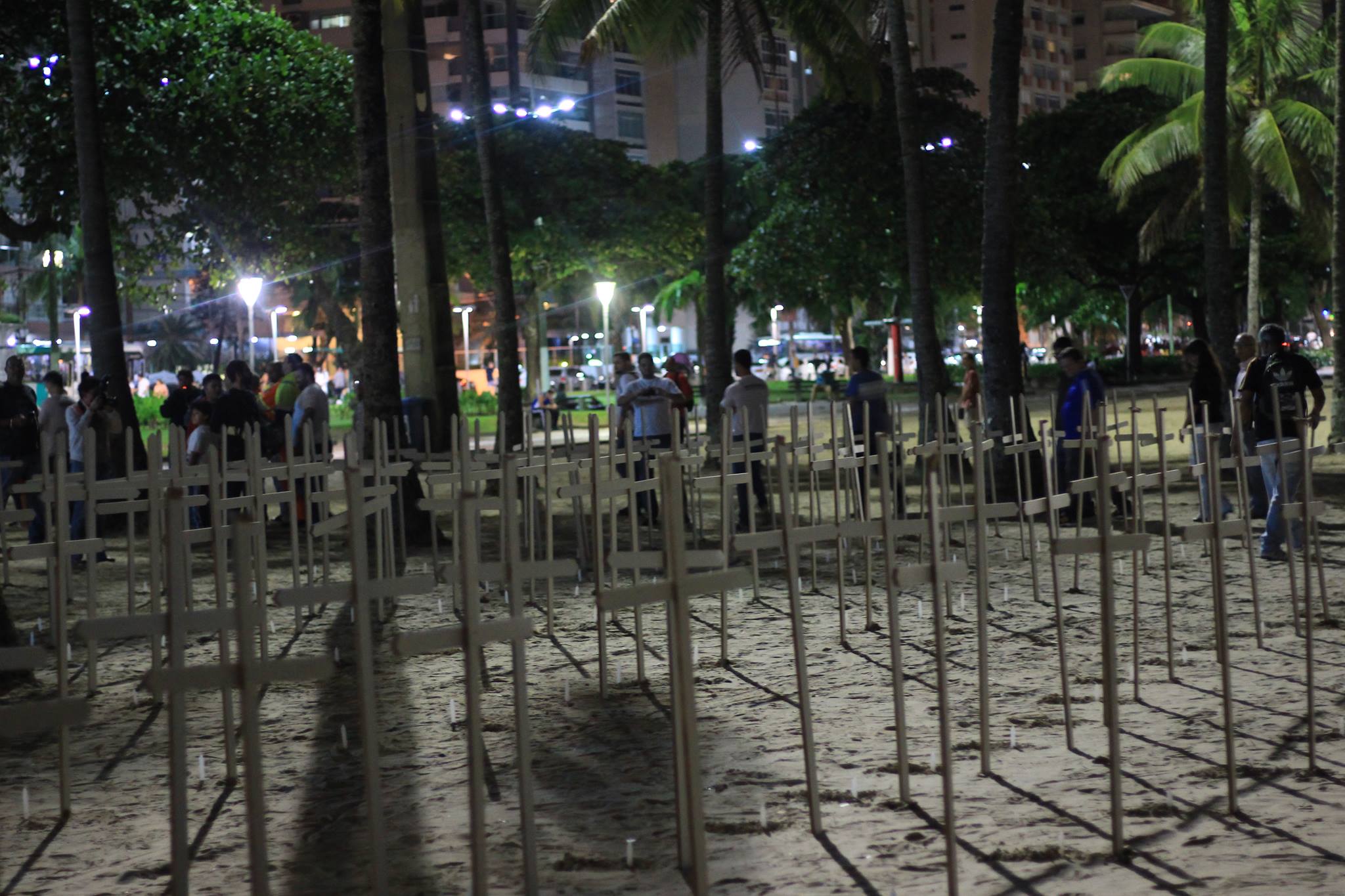 Foram cravadas no "cemitério" da praia 296 cruzes e velas com os nomes dos deputados que aprovaram a reforma. A manifestação pretende chamar a atenção da população e mostrar para os políticos da região que a maioria dos trabalhadores não aprova as mudanças.
