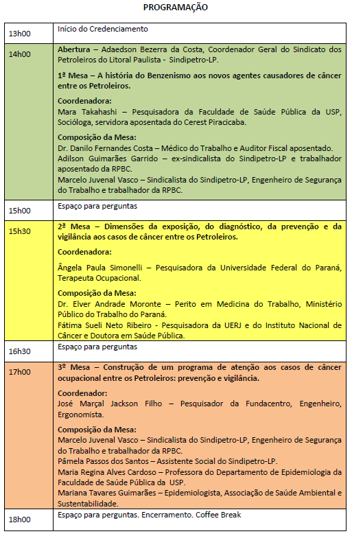 Por fim, o Seminário prevê uma mesa em que será proposta a ‘Construção de um programa de atenção aos casos de câncer ocupacional entre os petroleiros: prevenção e vigilância’. José Marçal Jackson Filho, engenheiro, ergonomista e pesquisador da Fundacentro conduzirá o debate. Na mesa, novamente Marcelo Juvenal; a assistente social do Sindipetro-LP, Pâmela Passos dos Santos; Maria Regina Alves Cardoso, professora do Departamento de Epidemiologia da Faculdade de Saúde Pública da USP; e Mariana Tavares Guimarães, epidemiologista que integra a Associação de Saúde Ambiental e Sustentabilidade.