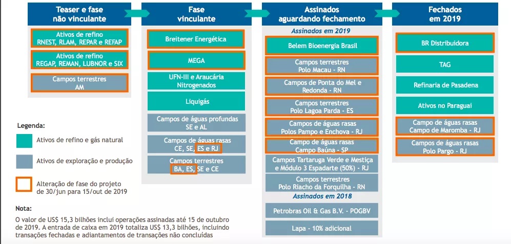 Em julho, a Petrobras fechou os contratos de venda dos polos Pampo e Enchova, na Bacia de Campo, para a Trident Energy, e do campo de Baúna, em Santos, para a Karoon. As operações representam um reforço de caixa de US$ 1,5 bilhão para a Petrobras, podendo chegar a US$ 1,7 bilhão.
