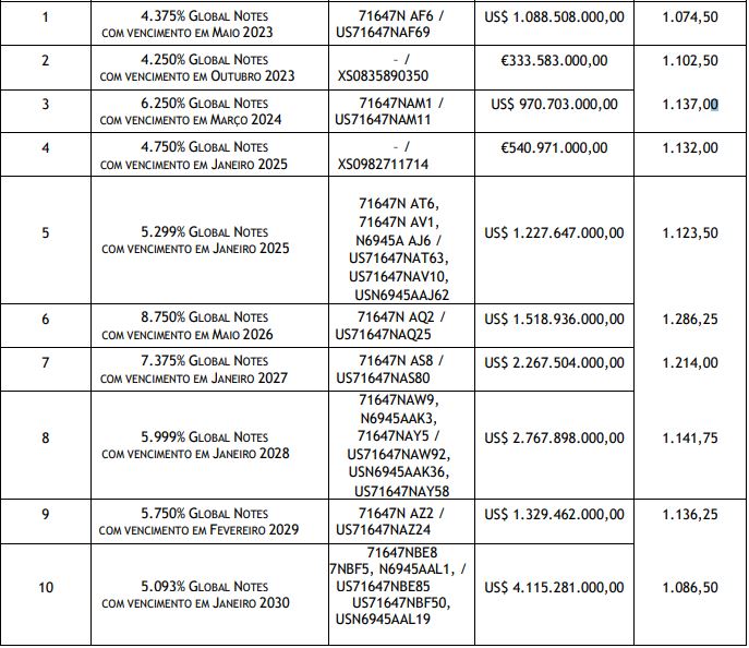 A oferta de recompra será expirada na próxima segunda-feira (19), às 17h do horário de Nova York. “Detentores de títulos que forem validamente entregues, não retirados e aceitos para recompra até a data de expiração receberão o pagamento total indicado na tabela acimano terceiro dia útil após a Data de Liquidação. Os detentores dos títulos também receberão os juros capitalizados até a Data de Liquidação“, diz o comunicado.