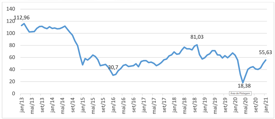Gráfico 1 – Preço médio mensal do Brent em dólares (em valores correntes)