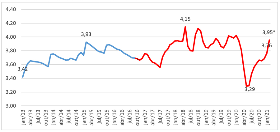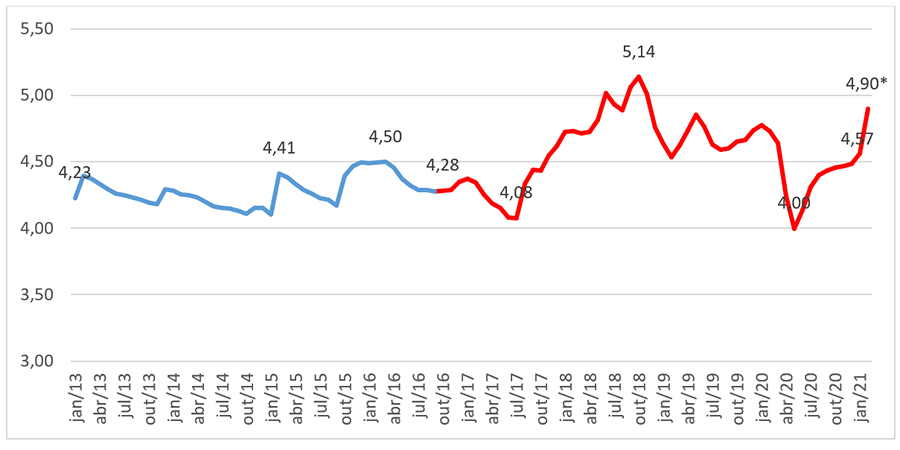 Gráfico 2 – Preço do Diesel S-10 nas revendedoras em valores reais de dezembro de 2020 (em vermelho os preços a partir da nova política de preços da Petrobrás)