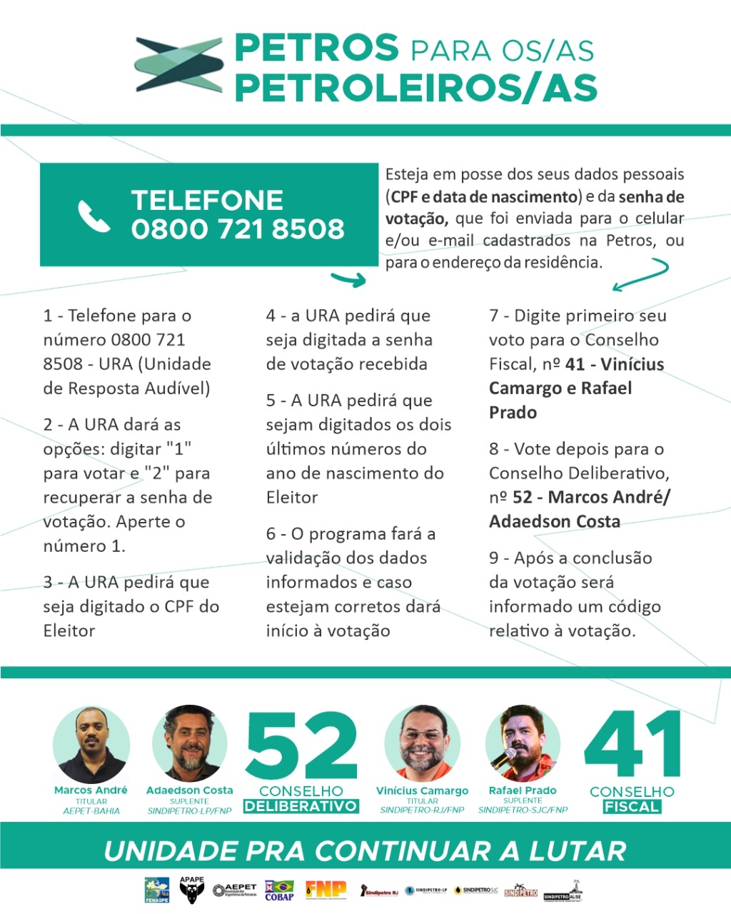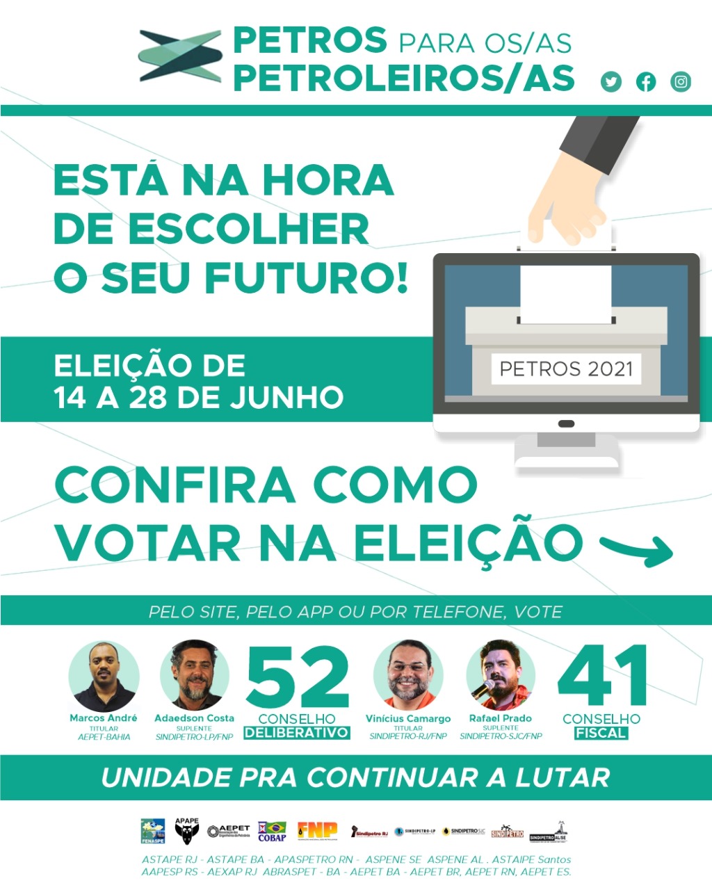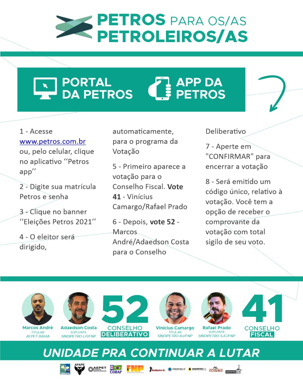 A chapa para Conselho Fiscal, com o número 41, é formada pelo titular Vinícius Camargo (Sindpetro – RJ/FNP) e pelo suplente Rafael Prado (Sindpetro-SJC/FNP). Para Conselho Deliberativo, a chapa número 52, tem como titular Marcos André (AEPET – Bahia) e suplente Adaedson Costa (Sindpetro-LP/FNP).