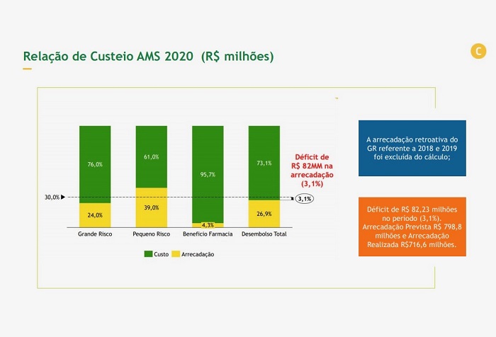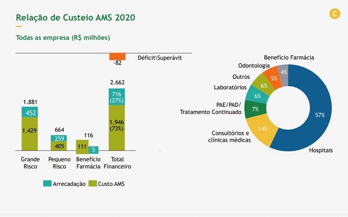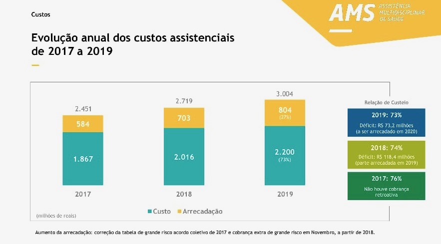 Considerando os números do relatório 2019 divulgado pela direção da Petrobrás, os gastos totais com os atendimentos aos beneficiários da AMS caíram de 3,004 bilhões para 2,662 bilhões, de 2019 para 2020, representando mais de 11% de queda. Voltando assim ao patamar de custos menores dos que os registrados em 2018.