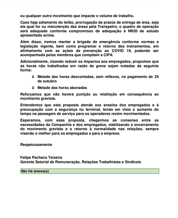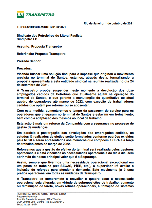 Diante da proposta da Transpetro, arrancada pelos trabalhadores grevistas, os petroleiros deixam registrado aqui que, caso a gestão da Transpetro não cumpra o que está sendo em minuta aprovada em assembleia, os trabalhadores do terminal Alemoa não se furtarão a exercer novamente o direito constitucional de greve, a fim de preservar seu direito a um trabalho seguro.