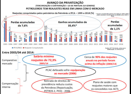 No último período, inclusive durante os governos do PT, os reajustes dos petroleiros não superaram os reajustes do salário mínimo. No acumulado, então, nem se fala. Mesmo com uma reformulação no plano de carreira em 2006, para equiparação ao mercado e parte de reajustes reais no período – alinhados ao que ocorreu em toda a iniciativa privada no período, os reajustes se mantiveram alinhados ao mercado de trabalho e desalinhados dos crescentes resultados (desenvolvimento dos investimentos, tecnologias e produção do Pré-Sal e aprimoramento do Refino e Gás e Energia) e dos lucros operacionais e financeiros que já revelavam o novo patamar em que os trabalhadores elevaram a Petrobrás.