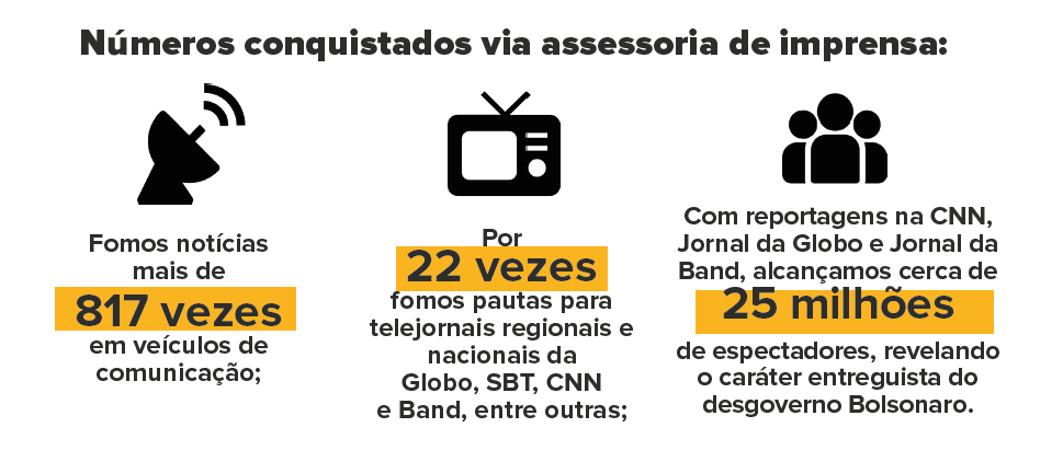 Para se ter uma ideia do tamanho do sucesso, nesse período o OSP foi notícia 817 vezes na imprensa, sendo que em 22 matérias foi destaque em telejornais regionais e nacionais da Globo, SBT, Band, CNN e outras. Uma exposição que fez o Observatório alcançar cerca de 25 milhões de pessoas, revelando o caráter entreguista do governo Bolsonaro.
