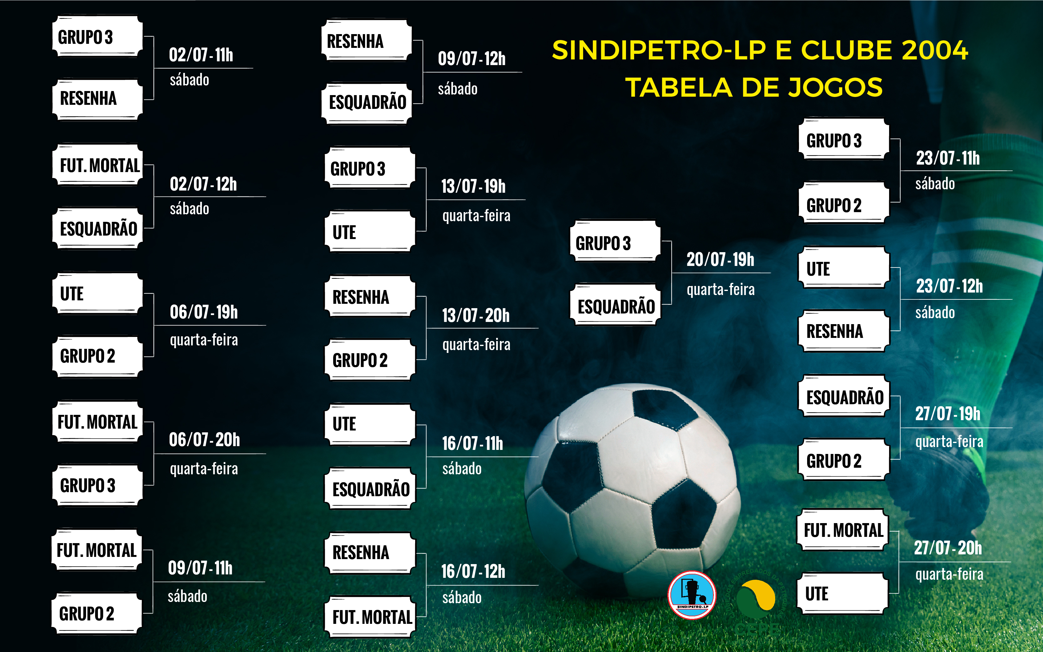 O campeonato de futebol Society do Sindipetro-LP/ CEPE 2004 já está com tudo pronto para começar no próximo sábado (02). No total, seis times irão disputar a taça. Essa edição do campeonato segue o regulamento dos anos anteriores e nessa primeira fase todas as equpes se enfrentarão. A tabela de jogos já está definida (veja abaixo). No sábado (02) será a vez do time Grupo 3 enfrentar os boleiros do Resenha, às 11h, e o Futebol Mortal e o Esquadrão entrarão em campo ao meio-dia.