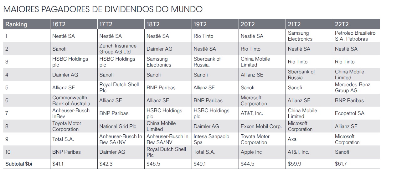 A Petrobrás e as outras empresas brasileiras ajudaram a impulsionar o novo recorde no pagamento de dividendos globais, aponta a gestora. Os proventos brasileiros totalizaram US$ 10,4 bilhões no segundo trimestre de 2022, maior valor da série iniciada em 2009, contra US$ 4,2 bilhões verificados no segundo trimestre do ano passado.